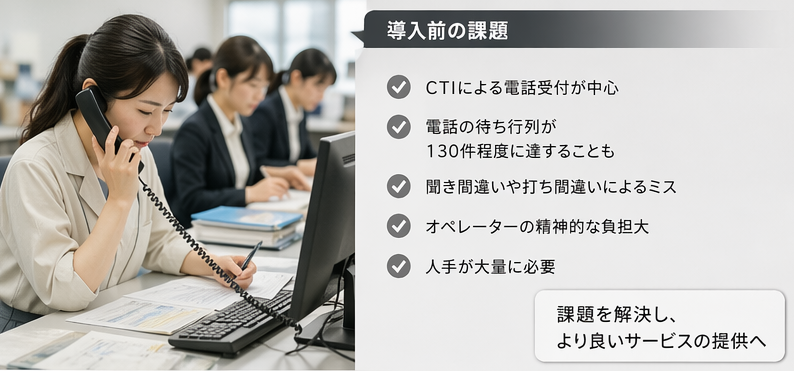 給食事業者様:以前はCTIによる電話受付が中心で、スタッフが電話口で注文を登録する形でした。電話の待ち行列が130件程度に達することもあり、人手も大量に必要でした。聞き間違いや打ち間違いによるミスも無視できませんでしたし、オペレーターの精神的な負担も相当なものでした。