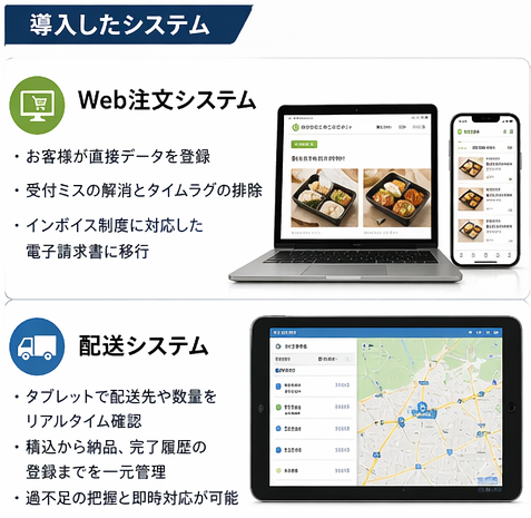 ある給食事業者様:この度、Web注文システムを導入しました。顧客が直接データを登録できるようになったことで、受付ミスの解消と受注のタイムラグの排除が実現しました。また、請求書についてもインボイス制度に対応した電子請求書に移行できています。