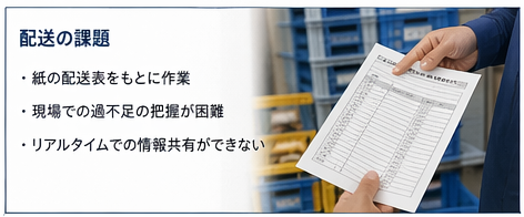 配送面でも、紙の配送表をもとに担当者が動いていたため、現場での過不足の把握が困難な状況でした。