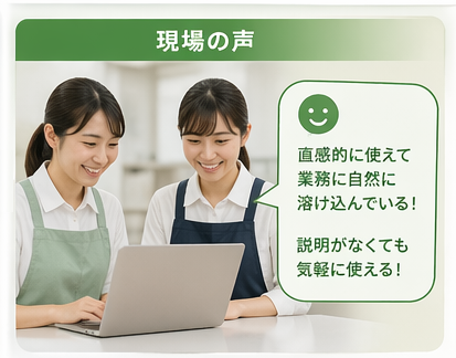 給食事業者様:スタッフからは「直感的に使えて業務に自然に溶け込んでいる」という声が多く上がっています。特に説明がなくても気軽に触れる点が好評で、それぞれが迷わずスムーズに業務を進められています。このシステムを使うことが、今では当たり前の風景になっています。