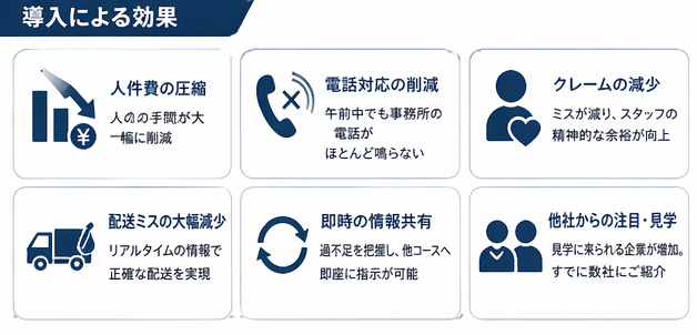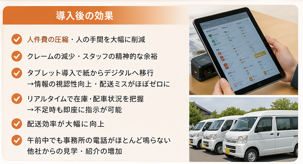 配送業務の変化も見逃せません。タブレットの導入によって紙からデジタルへ移行したことで情報の視認性が格段に上がり、配送ミスがほぼなくなりました。弁当が不足した際にも、他コースの車両がリアルタイムで何個持っているかがわかるため、即座に指示を出すことができます。配送効率は大幅に向上しました。