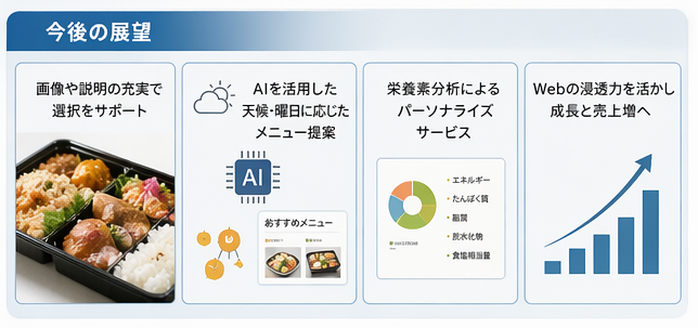これらを乗り越えるために、Web注文ならではの機能をさらに活用していきたいと考えています。画像や説明を充実させて顧客の選択をサポートするほか、AIを活用した天候・曜日に応じたメニュー提案や栄養素分析など、よりパーソナライズされたサービスの提供も視野に入れています。Webの浸透度の高さを活かして、成長と売上増につなげていきたいですね。